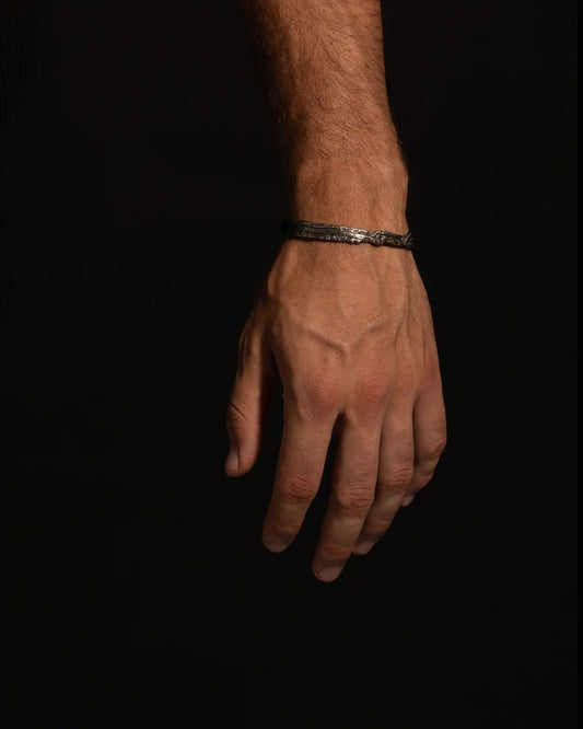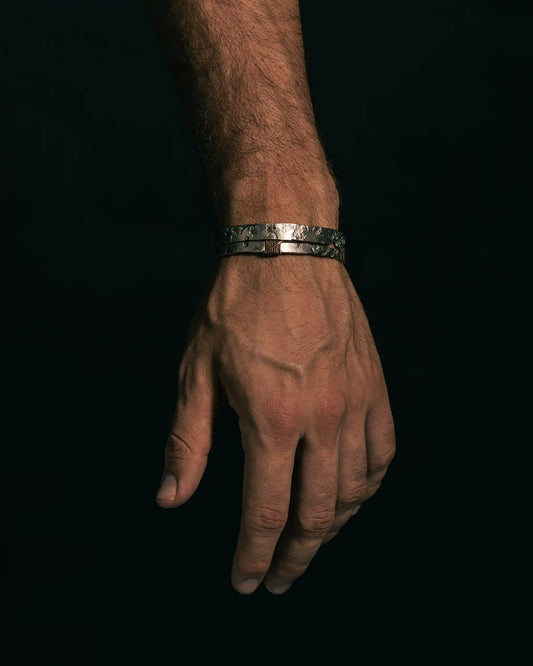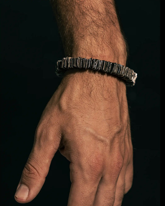 Bold silver bracelets with artisanal textures, unique links, and symbolic accents. Made to order in Barcelona.